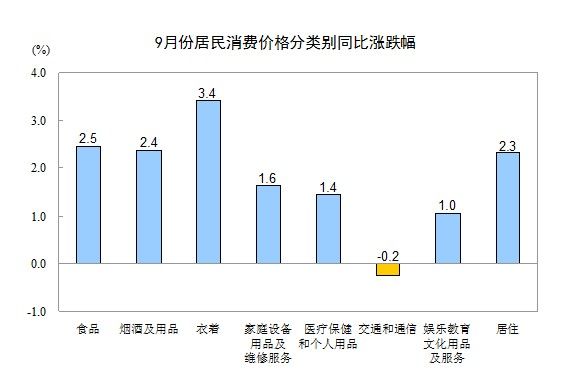 9月份,食品價格同比上漲2.5%,影響居民消費價格總水平同比上漲約0.79個百分點。其中,鮮菜價格上漲11.1%,影響居民消費價格總水平上漲約0.30個百分點;鮮果價格上漲7.2%,影響居民消費價格總水平上漲約0.13個百分點;水產品價格上漲4.5%,影響居民消費價格總水平上漲約0.11個百分點;糧食價格上漲3.7%,影響居民消費價格總水平上漲約0.11個百分點;油脂價格上漲4.1%,影響居民消費價格總水平上漲約0.05個百分點;肉禽及其制品價格下降6.0%,影響居民消費價格總水平下降約0.48個百分點(豬肉價格下降17.6%,影響居民消費價格總水平下降約0.68個百分點)。
