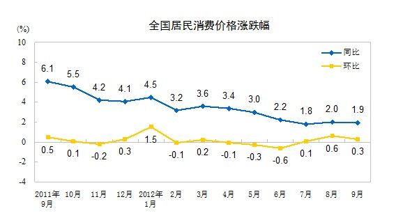 2012年9月份,全國居民消費價格總水平同比上漲1.9%。其中,城市上漲2.0%,農村上漲1.7%;食品價格上漲2.5%,非食品價格上漲1.7%;消費品價格上漲1.8%,服務項目價格上漲2.3%。1-9月平均,全國居民消費價格總水平比去年同期上漲2.8%。