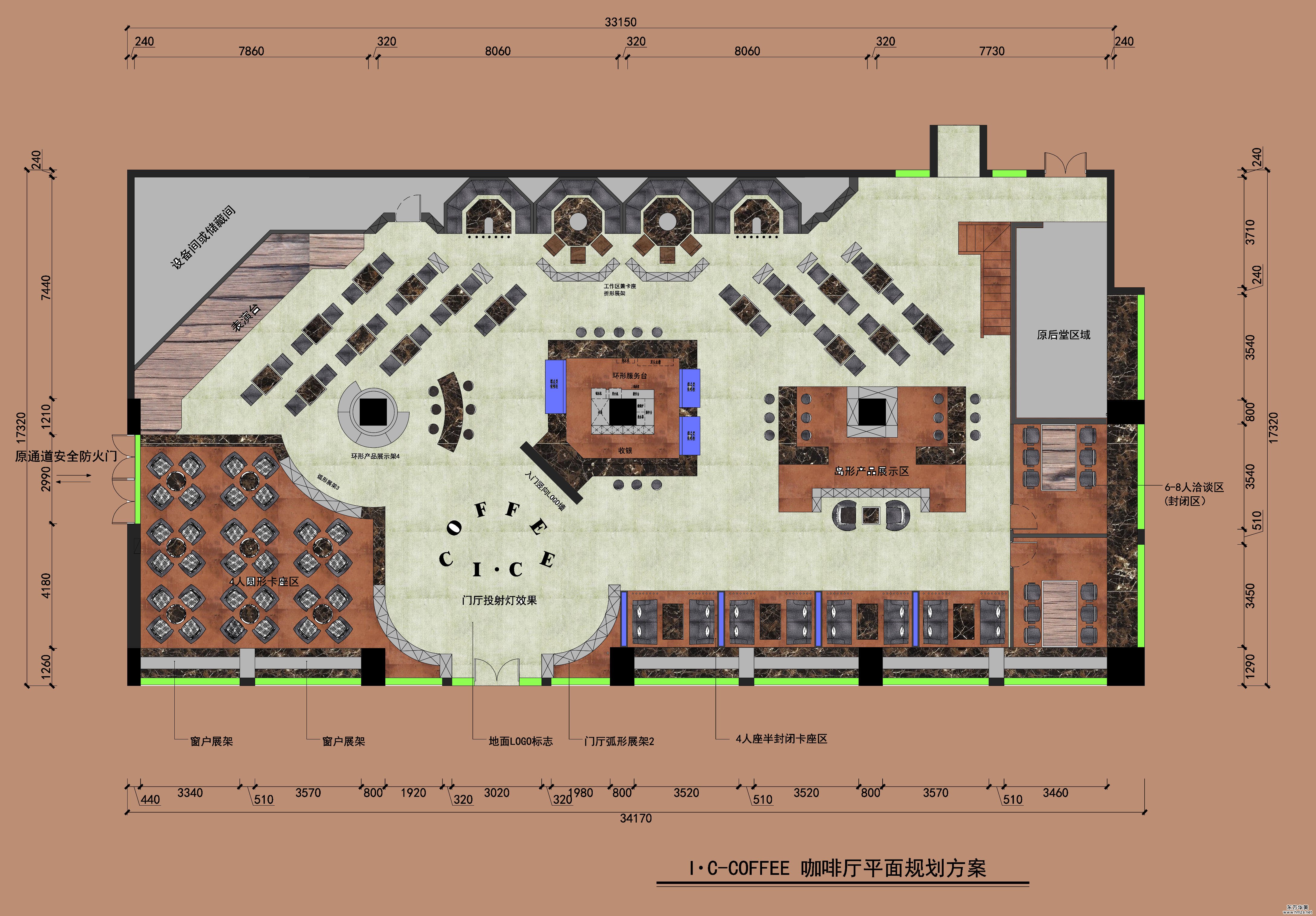 ▄設(shè)計(jì)風(fēng)格定位: 針對(duì)當(dāng)下咖啡廳特色、特點(diǎn)、結(jié)合IC咖啡的品牌、形象、服務(wù)、理念,由此裝飾設(shè)計(jì)的訴求點(diǎn)在未來5-15年的經(jīng)營過程中完勝于周圍已存在的類似性經(jīng)營場(chǎng)所。因項(xiàng)目處于建筑物一層,市政綠化帶以內(nèi)無視線阻擋,視線開闊,門頭設(shè)計(jì)可反向于原建筑幕墻體增加咖啡廳的特點(diǎn),又不失檔次,夜幕下利用櫥窗展示體現(xiàn)出亮化效果。 此案例的主要風(fēng)格是復(fù)古工業(yè)風(fēng),空間布局上以環(huán)形動(dòng)線為主,分為入場(chǎng)主動(dòng)線、入各功能區(qū)輔助線、展示區(qū)觀賞停頓動(dòng)線,環(huán)型服務(wù)臺(tái)可服務(wù)四周。以經(jīng)營者的思路易進(jìn)不易出的動(dòng)線設(shè)計(jì),橫向流動(dòng),豎向45度向內(nèi)引導(dǎo)“八”字形設(shè)計(jì),聚焦于前位島式展臺(tái)、中位環(huán)形服務(wù)臺(tái)、內(nèi)位表演區(qū)及藝術(shù)長(zhǎng)廊式展架,第一個(gè)點(diǎn)都留有讓消費(fèi)者駐足的理由。 在空間構(gòu)成上,呈現(xiàn)出最佳設(shè)計(jì)效果,材料的合理運(yùn)用體現(xiàn)了裝飾的最佳立體質(zhì)感,局部采用金屬色、銹紅色以及深色,為了更好的體現(xiàn)整個(gè)咖啡廳的氛圍,立面材料運(yùn)用多元而不繁雜,燈光和家具的選用也是重中之重。
